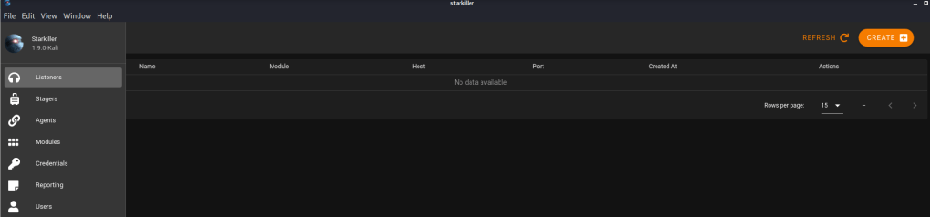 Once logged in, starkiller opens to the Listeners screen by default. From here on I’m going to focus on basic usage, but for a specific attack vector, so I won’t be going into detail on anything else. However, all of the information is either available on their Github or a linked wiki from there.