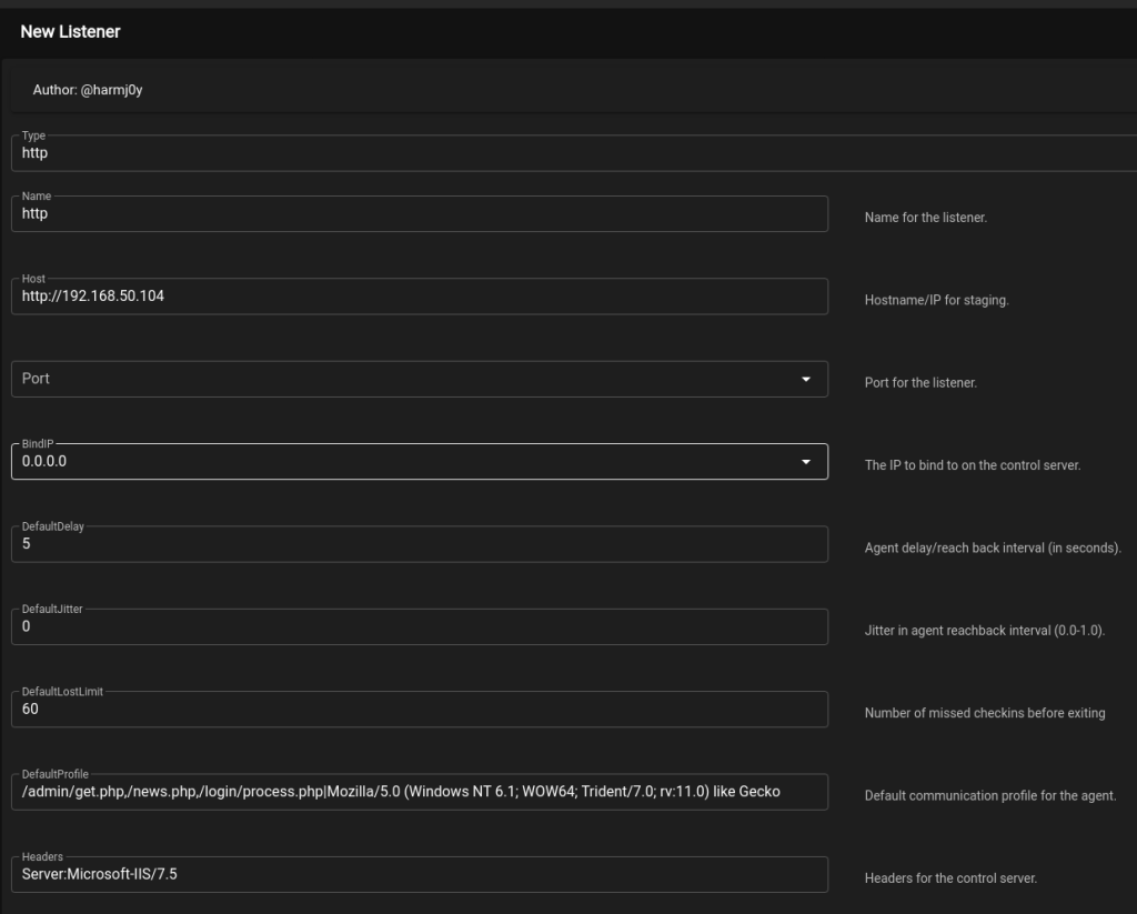 This leads to the listener configuration screen with quite a few more options. This is also the first place I want to point out some settings that should definitely be changed if you’re planning to use Empire in a real engagement and don’t want to be caught immediately.