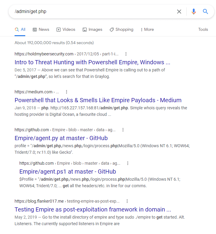 All of the settings seen above are defaults for the http listener. The hostname and port will always need to be changed to match the server you’re running Empire on and listener name should be changed to anything you want that makes it easier to recognize what it’s for. Other items like “DefaultProfile” and “Headers”, which controls what the HTTP server looks like, should always be modified. As Empire is open-source, most modern AV/EDR vendors will have extensive IoCs (Indicators of compromise) for the default settings and behavior of the tool. As an example, if I google one of the default paths set in DefaultProfile, it’s pretty obvious what it’s associated with.