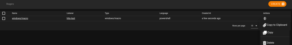 Once submitted, the stager is created and we can choose to copy the payload to the clipboard. Other options generate files that can be downloaded, but it just depends on the type of stager being used.