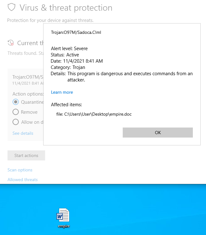 On another machine, I created a Word document named “empire.doc” (.doc still executes macros) and created a macro using the payload generated by Empire. After I copied the file over to the machine, Defender immediately flagged it as malicious. The detection unfortunately doesn’t say too much about what it thinks is malicious.