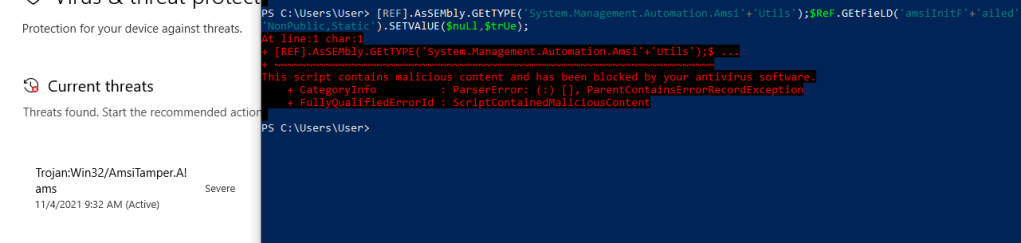 Unfortunately, it looks like the bypass itself is detected as malicious and even associated with an “AmsiTamper” signature. I’m not going to worry about the ETW bypass for now, but it was also seen as malicious on its own.