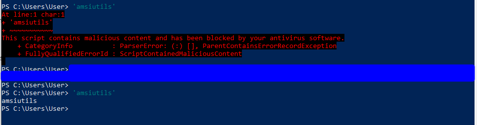 I mentioned earlier that most of the publicly available AMSI bypasses have signatures that prevent them from working correctly, but that is not the case for all of them. I don’t want to make the process too easy for someone who may be looking to do something actually malicious so I’ll leave the step of identifying a working one up to you, but here’s proof that it exists. The string ‘amsiutils’ is a simple test for detecting if AMSI is enabled and it no longer triggers after the bypass is run.