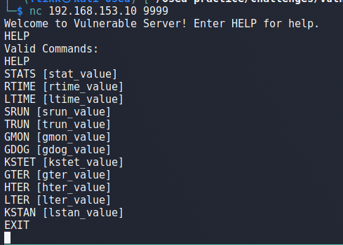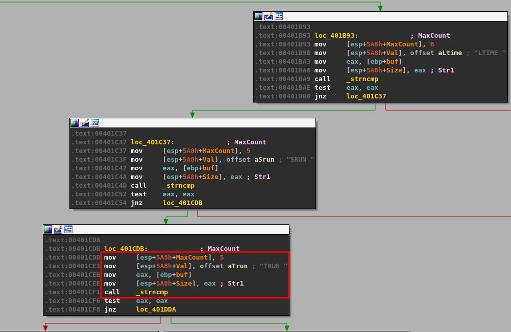 Several more similar comparisons occur after these blocks if the string comparisons continue to not return 0 (equal), each checking for the different commands seen before: HELP, STATS, RTIME, etc.