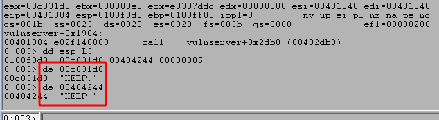 Continuing execution in WinDbg to the next compare we saw in IDA appears to check for the same word, HELP, but this time only checks the first 4 characters. As the first 4 characters in our string are the same as the string being checked by the application, this time strncmp returns with 0, indicating they are the same and the next jump will not be taken.