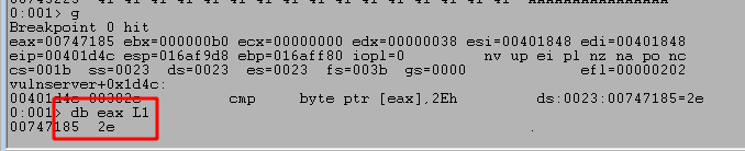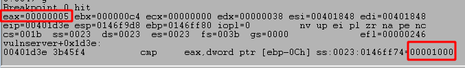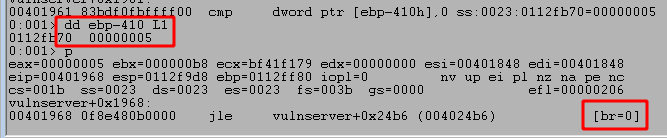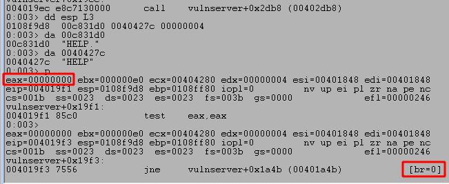 We know we sent the word HELP as the command, so the length of data should be greater than 0, but we can also confirm this in WinDbg by stepping forward a few more instructions to the CMP and JLE calls. The first highlighted box below shows the value returned by recv that is being compared to 0, in this case a length of 5 because ‘HELP’ is 4 characters followed by a null byte to terminate the string. The second highlighted box shows that the result of the compare will cause us not to take the jump indicated because our value is not less than or equal to 0. If the second box contained ‘br=1’ then it would indicate the jump will be taken.