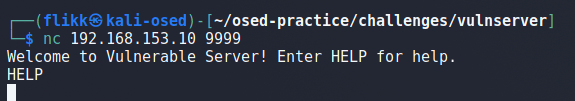 The breakpoint is actually hit the first time when I initiate the netcat connection from my Kali machine. For now, I used the WinDbg command pt to continue execution until the next ret instruction, which should be at the very end of the function, but it does not finish because no data has been sent yet. When I submit the command HELP, we can see the execution successfully continues to the end of the recv function and pauses execution at the instruction ret 10h.