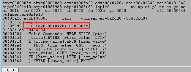 Inspecting the call to memcpy in WinDbg shows the 3 arguments it takes in: the buffer to copy data into (0x0108fa28), the data to copy (0x00404284), and the number of bytes to copy (0xfb or 251). We can also look at the 2nd argument to see the full string of valid commands it will be returning, which matches what we saw when interacting with the application earlier.