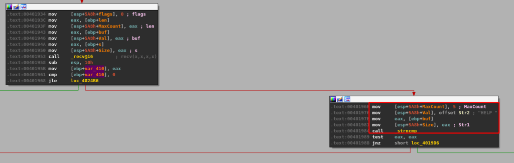 Moving back to IDA and following the red line to the next code block brings us to a call of the function strncmp, which compares two strings. In this case, the arguments we see being used for the compare appear to only take a maximum length of 5 and compare it against the string ‘HELP ‘ (with a space at the end). If the strings compared are the same, strncmp will return 0, which means the test eax, eax instruction following it would also return 0 and set the zero flag. If the strings are not the same, a non-zero number would be returned and the TEST instruction would not set the zero flag. The zero flag is important because the following jump instruction, JNZ, will only be taken if the zero flag is not set.