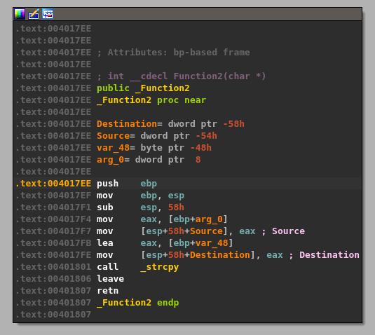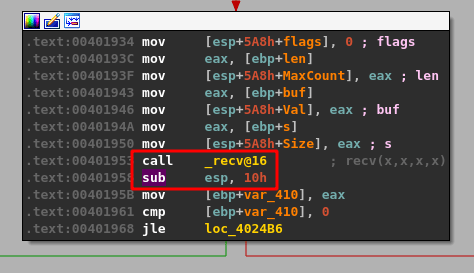 As ASLR is not currently enabled for this application, the memory address listed in the image above (0x00401958) should match up with the same instruction for the application in IDA. Switching back to IDA and using the g shortcut to jump to a memory address takes me to the instruction at 0x00401958, which does indeed come right after the call to recv.