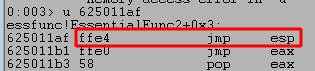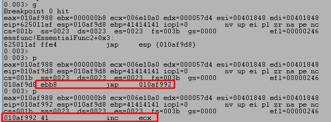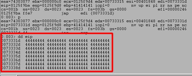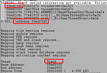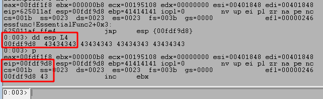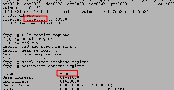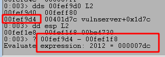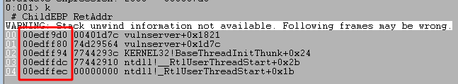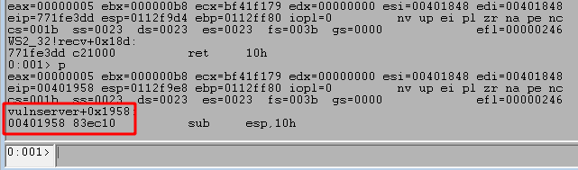 Stepping forward one more instruction with the p command returns out of the recv function and back into memory space associated with the vulnserver application, which should be immediately following the call to recv.