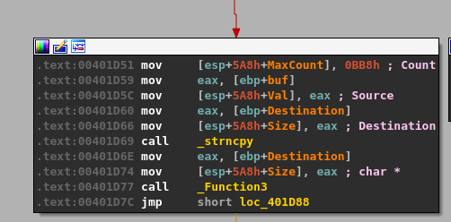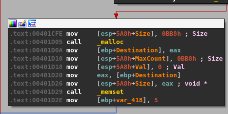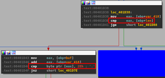 The recv function’s return value is the total number of bytes it received (stored in EAX), so the CMP instruction in the code block above is moving that number into a variable and comparing it against 0, essentially to check whether the data was empty or not. If no data was sent (EAX == 0) then the jump along the green line indicated by the JLE (Jump if less or equal) instruction will be taken, otherwise execution will move to the next block along the red line.