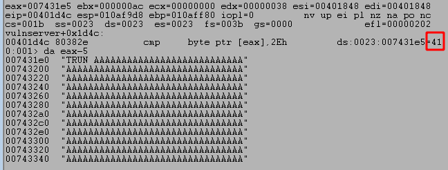 I’m going to end this post here for now to avoid having just one extremely long post as this portion was intended to be an introduction to how we’re using WinDbg and IDA to investigate the program. In the next part I’ll go through the details of how we can discover and exploit the vulnerability through the TRUN command.
