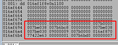 Double-clicking the string on the second line above takes us to the section of memory where the string itself is stored. This shows us several other strings stored in the same area, but still does not give us the full command being run by PowerShell.