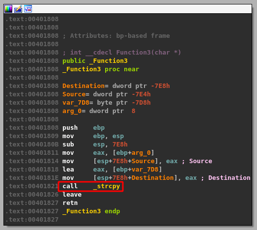 Now that we have an idea of how the application works, it’s time to focus on some of the specific commands. After stepping through some of the functions in IDA, I’m going to start with the TRUN command as it ends up allowing a basic stack overflow through the use of the strcpy function.
