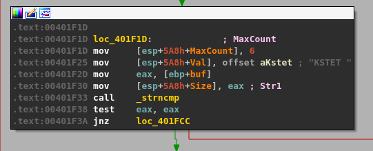 At this point we have oriented ourselves to where the application reads in user input through recv, which means the next group of instructions will likely be logic to first determine if there was any data actually sent and second if the data matches with one of the valid commands the application has defined.