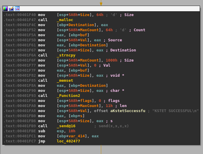 Following execution one more time to the next block finally brings us to some more substantial code that appears to copy a string with a list of valid commands into a buffer with memcpy and send the contents of that buffer back to the user with send().