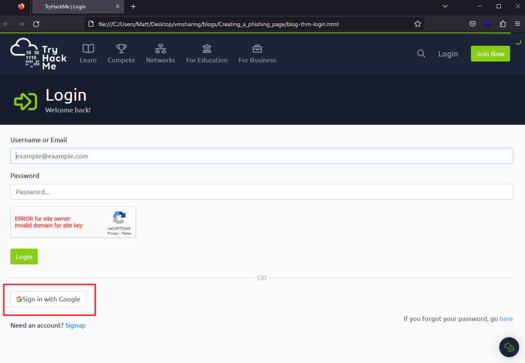 The fix for this is to simply replace any relative URLs with their absolute versions. This means changing something like “/assets/page/pace.js” to “https://tryhackme.com/assets/pace/pace.js”. Doing this for the rest of the relative URLs in the source, saving, and reloading gives us the page seen below where the Google image is not rendering correctly, though we still have an issue with the CAPTCHA box. You can save some time changing these URLs using regex patterns in your text editor of choice, but I’ll leave that to the reader for now.
