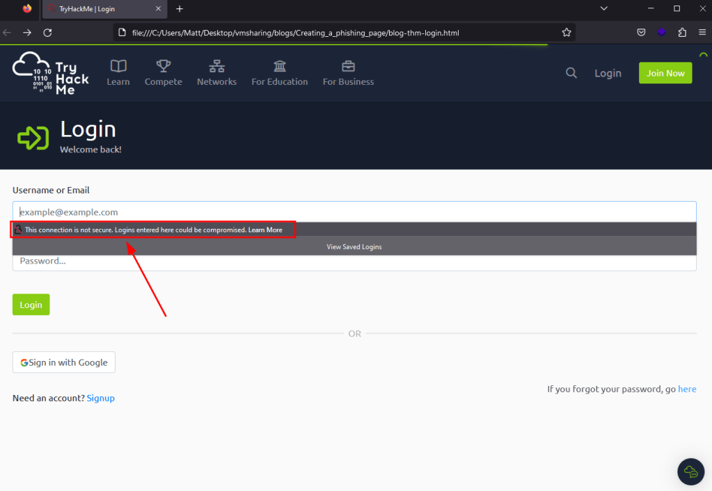 While this is working correctly, there are still a few issues that might deter a user from actually submitting their credentials to the site. As seen below, when the page loads now the form displays a message that the connection is not secure because our action parameter now points to a URL using HTTP instead of HTTPS. Now, in a real-world scenario many users may not even notice or care about this warning, but it’s a good idea to try and make the clone be as realistic as possible.