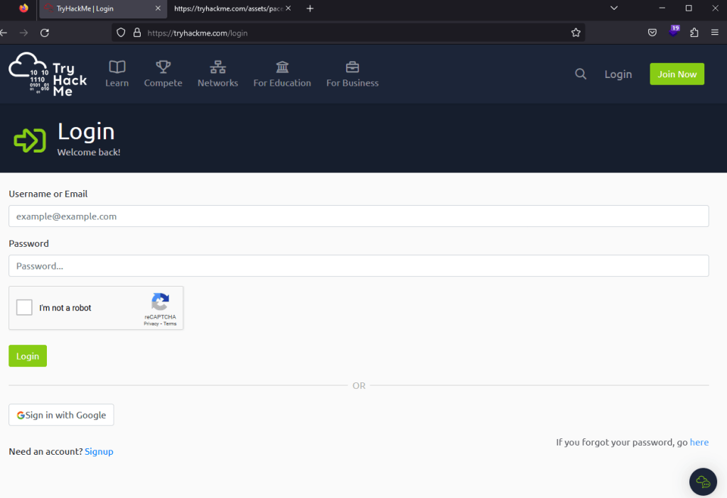 For this example, I’m going to use the login page for TryHackMe as seen below. It’s a standard login with a CAPTCHA, logos, and other assets that are loaded, along with the form for both username and password.