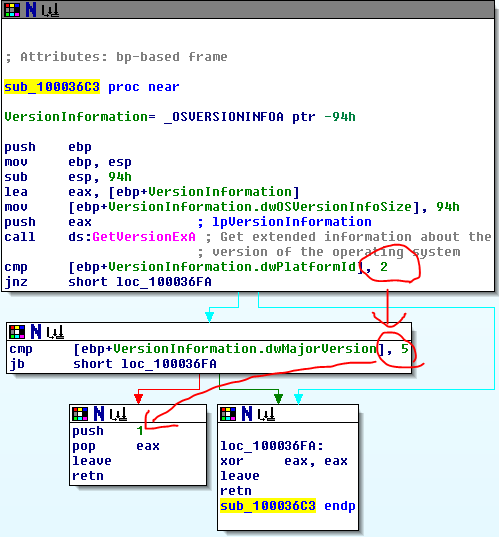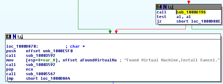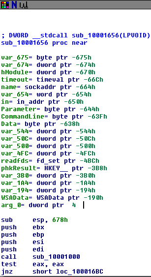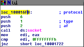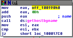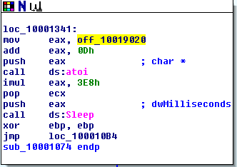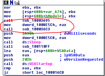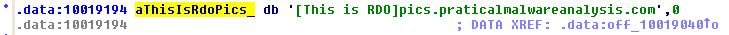The purpose of this program seems to be to attempt a denial of service attack on the http://www.malwareanalysis.com website. It sets the “DueTime” value to midnight on January 1, 2100 and starts into a loop of connecting to the website above to download the home page over and over again. The second screenshot below shows how the program uses the InternetOpenURLA function to download http://www.malwareanalysisbook.com” and then jumps right back to the start of the same section to repeat the action again.